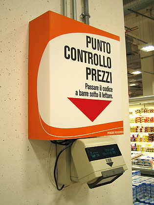 IPER COOPという大型Supermercato(スーペルメルカート)で 値段のわからない商品のバーコードを読み込み 値段を表示する機械を撮影してきました 広い店内で近くに店員さんがいない時用に設置されているのだと思います 日本でもトイザラズ等 やはり大型店舗に同じような機械がありますが 撮影してみました