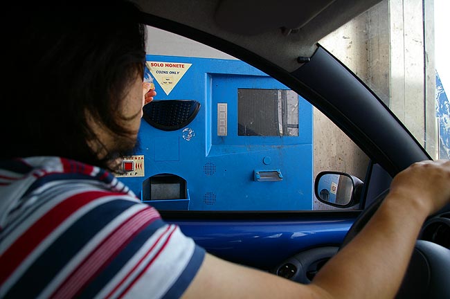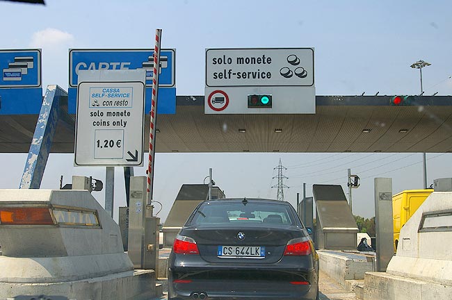 写真はTangenzialeの料金所にて 今回の道順の場合 Tangenziale利用料1.20 EUROをまず支払います このゲートは係の人がいるものではなく コインのみを受け付ける自動支払機用のゲートです