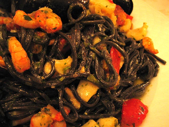 晩ご飯はGenova家庭料理の店で これは魚貝類とイカスミのリングイネ