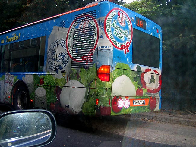 Bergamo新市街で見かけたモッツァレラの広告の入ったアウトブス