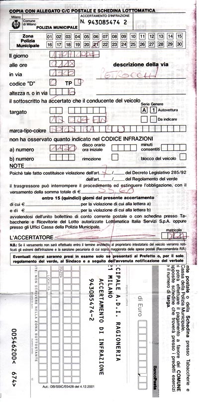 イタリアでは車を所有する時に車庫証明は必要ないらしく 多くの方が自分の家の前等へ路上駐車しています 我が家もお借りしている車を その例に習って家の前に停めておきました その場合1点だけ注意点があったんです こちらの道路は週に1回清掃が行わます 多くの場合深夜にしてくれていますが その時だけは駐車していてはいけないんです たいてい標識が立ててあり『何曜日の何時から清掃をします』と書いてあります うっかりしていた私は 清掃の夜 駐車違反をきられてしまいました これはその時の朝 車のフロントガラスのワイパーに挟まっていた切符です